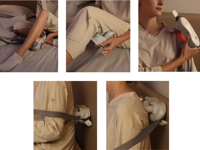 - Kéo tay chủ động: Dùng hai tay kéo dây đai xuống để cố định thiết bị để giúp đầu massage áp sát và tăng hiệu quả tác động.